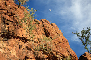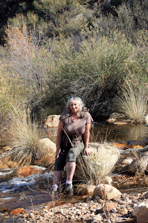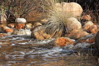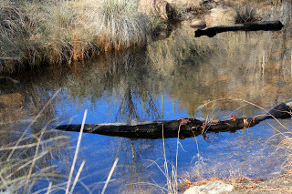 Since I have been here over many years, I can remember times where crossing this stream meant almost hip high. I don't do this, of course, when the floods are at the dangerous levels, where flash floods are likely, where the water has the force to take down trees. One year, after such a flood, the whole canyon view was changed with most of the big trees gone, those without the right roots to hold on.