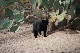 Two of our cats have been outside and the short-hair, not an Arizona cat, found the wash this time and began running off into it. With the vision of three coyotes there recently, still in my vivid memory, limited freedom is in order.