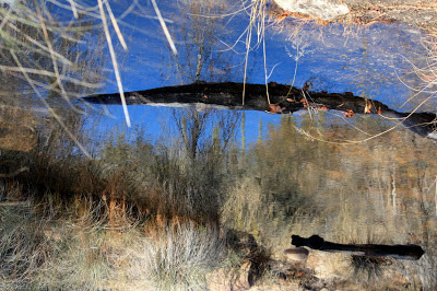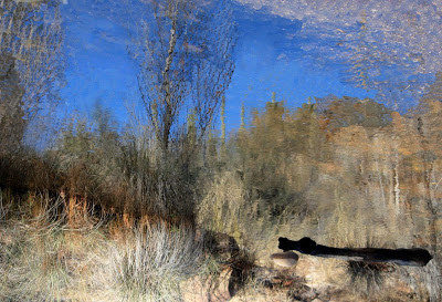 Interesting reflections in water require several elements-- some degree of stillness in the water, something above worthy of being reflected, and little or no breeze. They might be found in a puddle, lake, creek, river. Capturing them with a camera is a bit of a challenge helped much by having a polarizing lens.