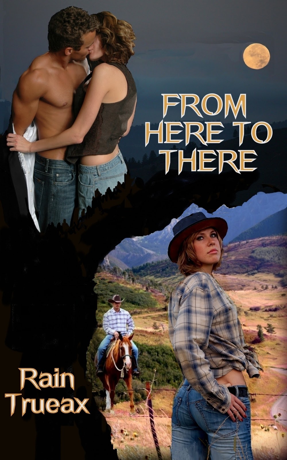 When I create a cover, it often is as much instinct as it is plan (my oil paintings are a lot like that also). Such was the case when I decided to redo the cover for From Here to There. It had been out since January with the heroine in front, looking a little mystified and the hero riding a horse up toward her-- a barbed wire fence between them. The couple came from two purchased CanStock images that I had set into one of my own photos of the part of Montana where the story happens.