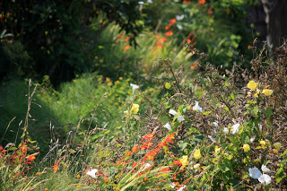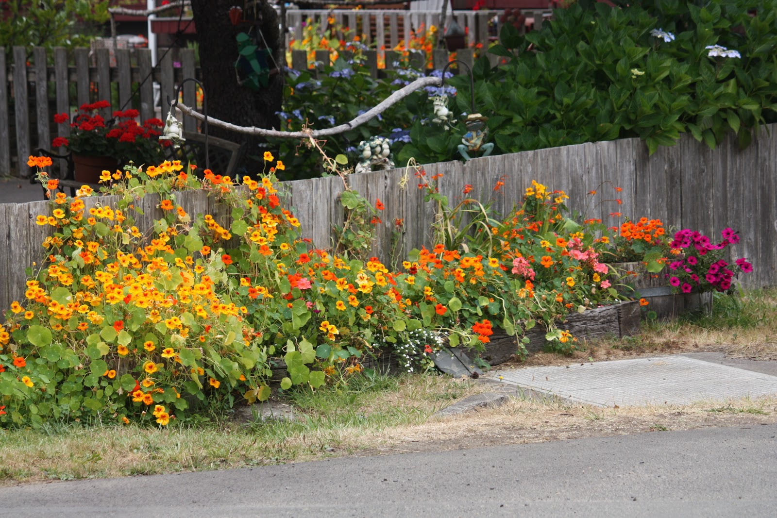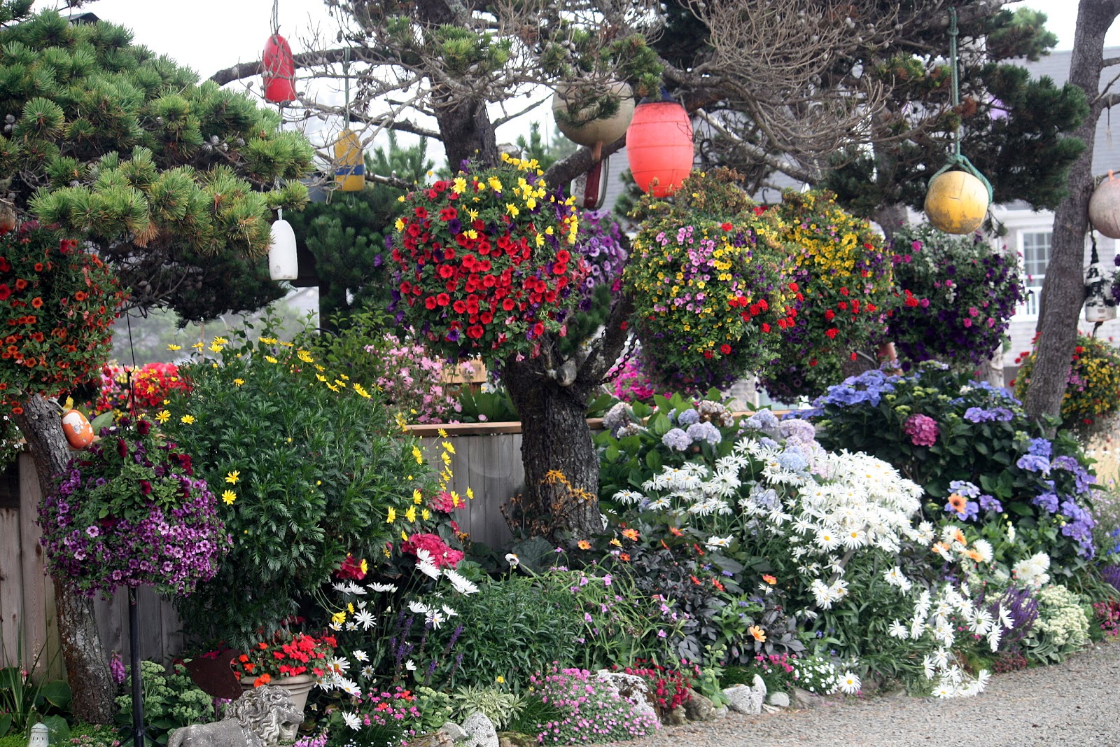 From August, the photos are of summer gardens along the Oregon Coast. I love gardens there as they can grow things that would freeze out here. Some are lush, overgrown but with a rush of colors. They bring back memories to me of the years my grandparents lived on the Coast. I like the funky sense of style mixing flowers, lanterns, planters, and colorful beach buoys.