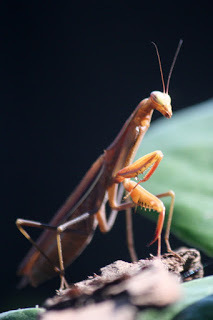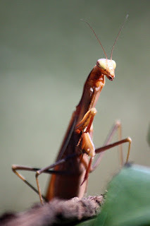 "The mantis comes to us when we need peace, quiet and calm in our lives. Usually the mantis makes an appearance when we've flooded our lives with so much business, activity, or chaos that we can no longer hear the still small voice within us because of the external din we've created. After observing this creature for any length of time you can see why the symbolism of the praying mantis deals with stillness and patience. The mantis takes her time, and lives her life at her own silent pace"It suits how I feel right now about the writing. I am collecting information and images-- even have most of a cover worked out. Meanwhile I am grateful to the praying mantis for the photographs for which it posed so nicely with over 30 shots-- 4 or 5 coming out very revealing of her personality.