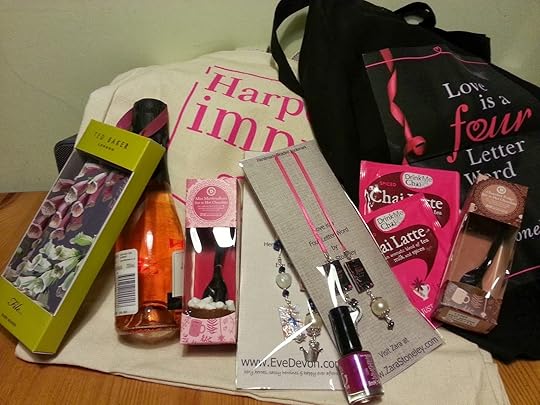 Contents: All the perfect ingredients for a girlie reading experience…10.00£/$ Amazon Gift Voucher (to purchase delicious ebooks)Her Best Laid Plans Beaded Bookmark (for a touch of book bling)Love is a Four Letter Word Beaded Bookmark (for a touch of book bling)Her Best Laid Plans/Love is a Four Letter Word Linen Bag (to keep all your reading experience ingredients together and handy for those urgent date night clothes shopping trips)Bottle of Bubbly (for if you don’t like hot chocolate/tea)Hot Chocolate/Tea Drinking Goodies (for if you don’t like bubbly)Chocolates (no explanation required!)Nail Varnish/Nail Files (for that break between reading books!)And it’s all inside a lovely HarperImpulse bag!