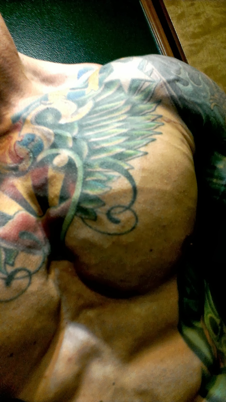 My favorite tattoo would definitely be my chest piece, I just love the flow of it and always wanted a chest piece. As for my most meaningful tattoo I have it would def be the heart with the mom banner through it on my right arm, I am definitely a mom's boy.