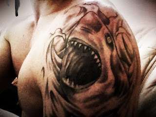 My favorite tattoo so far is my great white shark on my left shoulder. It was completely different than what I asked for but it blended in with my flowers I drew underneath it as well.