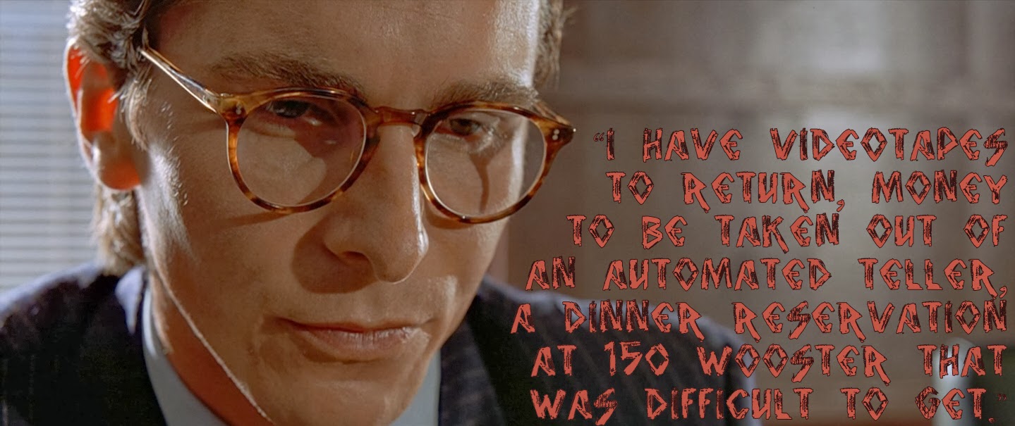In order to appreciate how far Bateman goes in his quest for sensation, or perhaps even existence, the reader has to be immersed in the sheer banality of his day-to-day life to a degree that borders upon absurd. As such, most of the novel’s word count is made up of meticulous descriptions of things and tedious encounters with people that are as hollow, cruel or flawed as our protagonist / antagonist - characteristics that Ellis delights in battering readers over the head with through a never-ending precession of pre-dinner drinks (usually spent fretting over not having reservations somewhere chic) and occasional luncheons.
