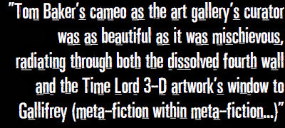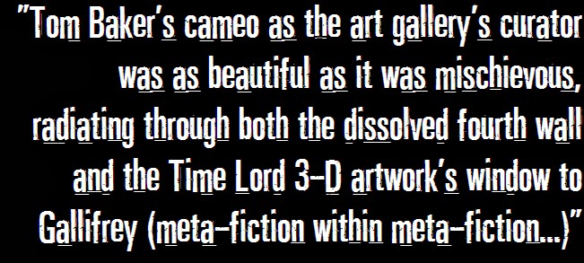 But the retcon wasn’t quite the end; indeed, ’twas a beginning. The Day of the Doctor concluded with a scene so nonsensically reverent that I would have forgiven the series anything. Tom Baker’s cameo as the art gallery’s curator was as beautiful as it was mischievous, radiating through both the dissolved fourth wall and the Time Lord 3-D artwork’s window to Gallifrey (meta-fiction within meta-fiction...), somewhere out there in the show’s future, yet tied to a past impossibly embodied in this eccentric old man. The whole spirit of the special is distilled right there; the collision between past and future, the disambiguation of seemingly separate titles, of seemingly separate men. It’s an all-time high point for Who.