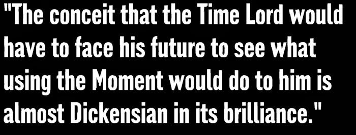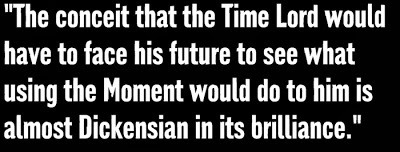 Like just about everyone else in the world, the news of David Tennant and Billie Piper’s return to the series led me to do some very sloppy arithmetic and end up with five. I half-dreaded the return of Rose and her quasi-Doctor lover, but lost just as much sleep pondering on the ramifications of Hurt’s incarnation meeting a Series 2 Rose, or the other two encountering her post-Bad Wolf Bay II. The same must have been true of Mr Moffat, as instead of bringing back the prototypical new companion, he cast her actress as the Moment - a living Time Lord weapon in the style of Nemesis (this is also the silver anniversary of Silver Nemesis, don’t forget) that stands in judgement of those who would deploy it. There may have been nowhere left for Rose Tyler to go, but there was a beautiful symmetry to be found in the very embodiment of the falling Time Lord’s darkest hour wearing the face of the woman whose love would eventually catch him to try and prick at his conscience. The conceit that the Time Lord would have to face his future to see what using the Moment would do to him is almost Dickensian in its brilliance.