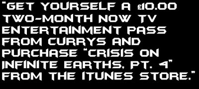 The silver living is that the iTunes Store have made the episode available to stream and download for just £2.49 as expected, meaning that us UK viewers won’t have to regress two formats to standard-definition DVD to be able to enjoy the complete, high-definition Crisis - provided that they get the Batwoman episode downloaded before Apple realise that they’ve made the “wrong” episode available (“How Queer Everything is Today!” has not dropped as it should have).