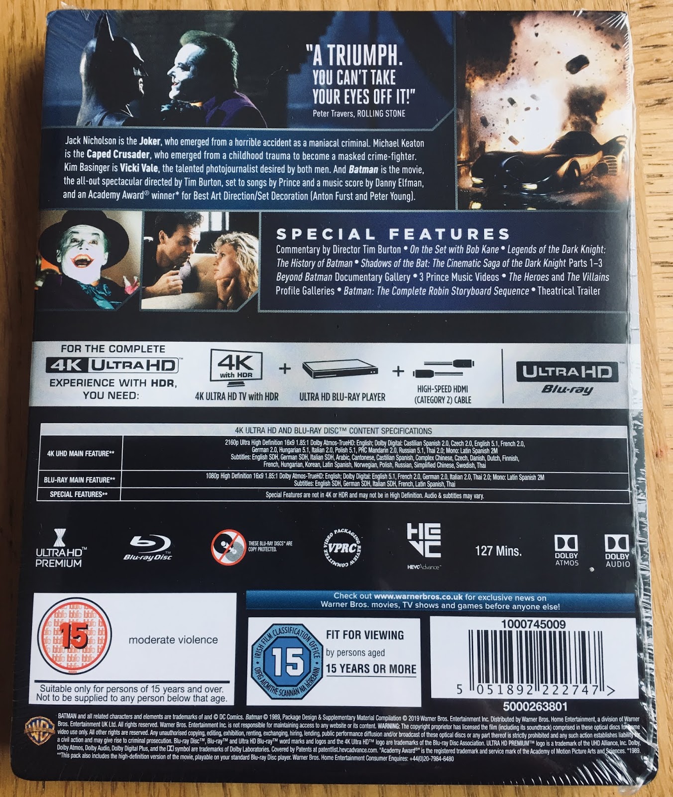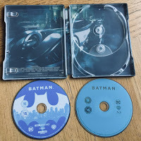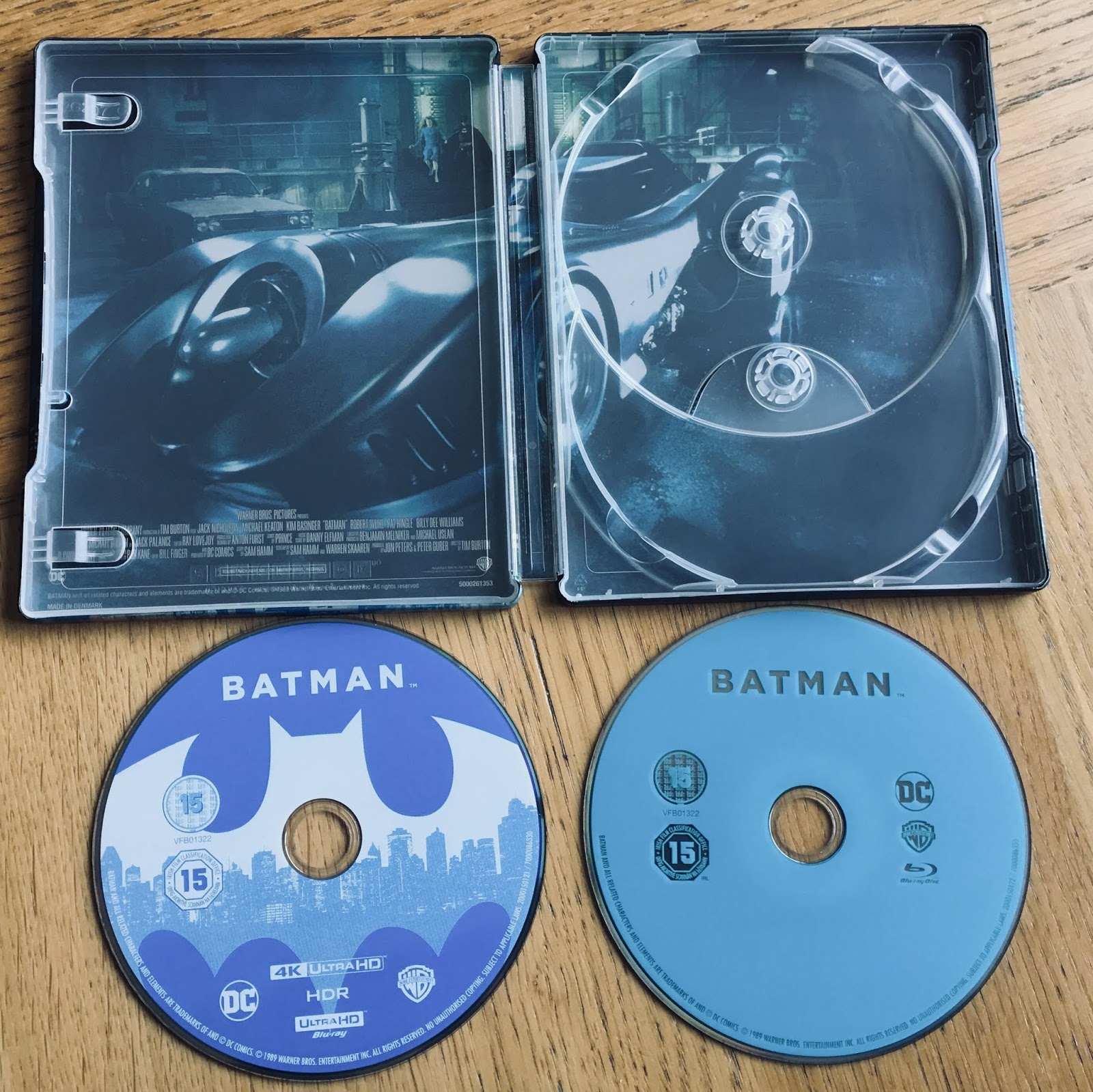 On 16th September a 4K UHD steelbook was released to tie in with Batman’s eightieth anniversary. A thing of quiet beauty, as moody and strong as the movie that it houses, it’s an offering that’s surprisingly - but tastefully - understated. As is often the case, the rear artwork is even more impressive than the more obvious front cover’s as it depicts Batman looking out over the city that he’s committed to protect, instantly conjuring the film’s brooding tone. Inside, the bullet-shaped Batmobile emerges from beneath the set’s two discs, only the movie-poster-style credits marring its slick finish.