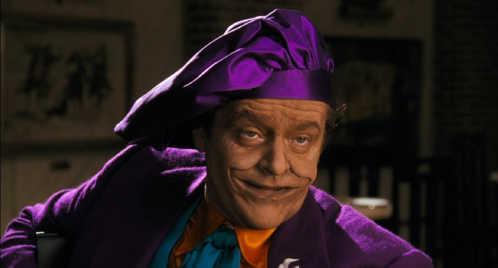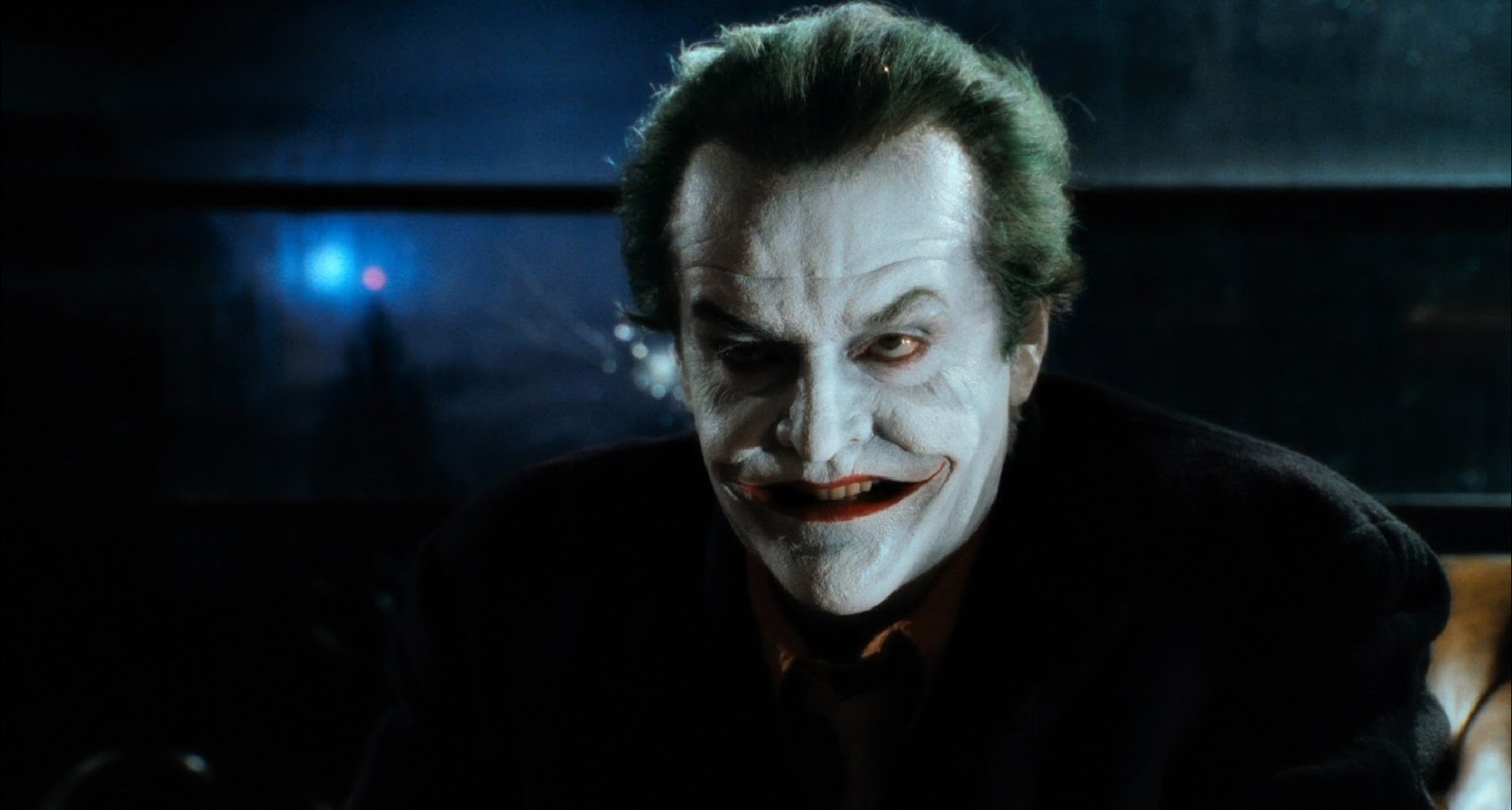 Where Keaton really excels though is in his performance of Bruce Wayne. Often treated as a mask worn by Batman, as opposed to vice-versa, this movie dispels any pre-existing ideas about Batman and his alter ego, instead creating a plausible amalgam persona that the movie sets out to dramatically tear in half. Hamm and Skaaren’s storyline makes a tragic lover out of the pretend playboy, juxtaposing Bruce’s apparent desire for love and a normal life against the nocturnal lure of warring on criminals to satiate the ghost of his slain parents. The figures of Vicki Vale (Kim Basinger) and Jack Napier (Jack Nicholson) embody these two competing lures as Bruce falls head-over-heels for one while Batman fixates on ending the threat posed by the other.