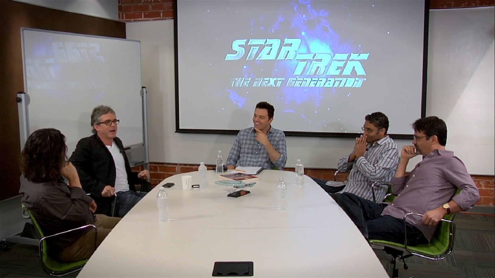 Inside the Writer’s Room, Seth MacFarlane’s sit-down with many of the TNG writers, runs for almost as long as the three-part documentary and covers much the same ground. However, the roundtable is a much more informal affair; there is a palpable sense of fun as four old friends (Ronald D Moore, Brannon Braga, Naren Shankar and René Echevarria) reunite to celebrate – and, occasionally, slag off – their former working environment. What’s evident from this feature that isn’t so much from Resistance is Futile is the camaraderie that existed between TNG’s “next generation” of writers – a family feeling that was clearly transposed onto the small screen through their depiction of the Enterprise-D crew.