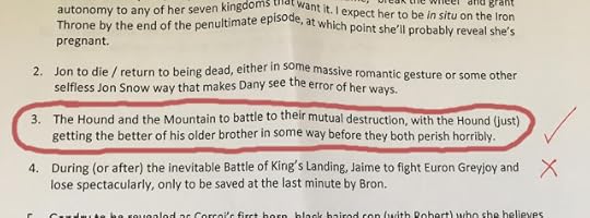 I do have some of my own issues with season, though these are relatively minor in comparison to those generally seized upon. Most of these were things that I thought ought to have played a part in the endgame; things that I can’t conceive Martin intends to leave out of his books. Arya doesn’t wear a single face all season, for instance, meaning that the only payoff for her becoming a fully-fledged Faceless Man was her murder of the Freys at the start of last season – something that will surely fall to Lady Stoneheart in print. Worse, the direwolves, introduced in the series’ first episode and clearly set up to play a major part in the resolution of the series, are represented only by Ghost who ultimately contributes nothing more than an ear to the defence of the realm. My biggest gripe, though, has to be with Bron and that damned crossbow. You don’t give a mercenary a weapon like that at the start of the season and not have him fire it by the season’s end. Don’t get me wrong, I would have hated it had he actually killed one of the Lannisters – even Cersei – which only goes to show how ill-conceived the whole angle was. It was clearly crowbarred in simply to give a popular character something to do ahead of his appointment as master of coin and lord of High Garden - two unlikely things that I want to hate, logically, but love all the same. Damn you, Jerome Flynn.
