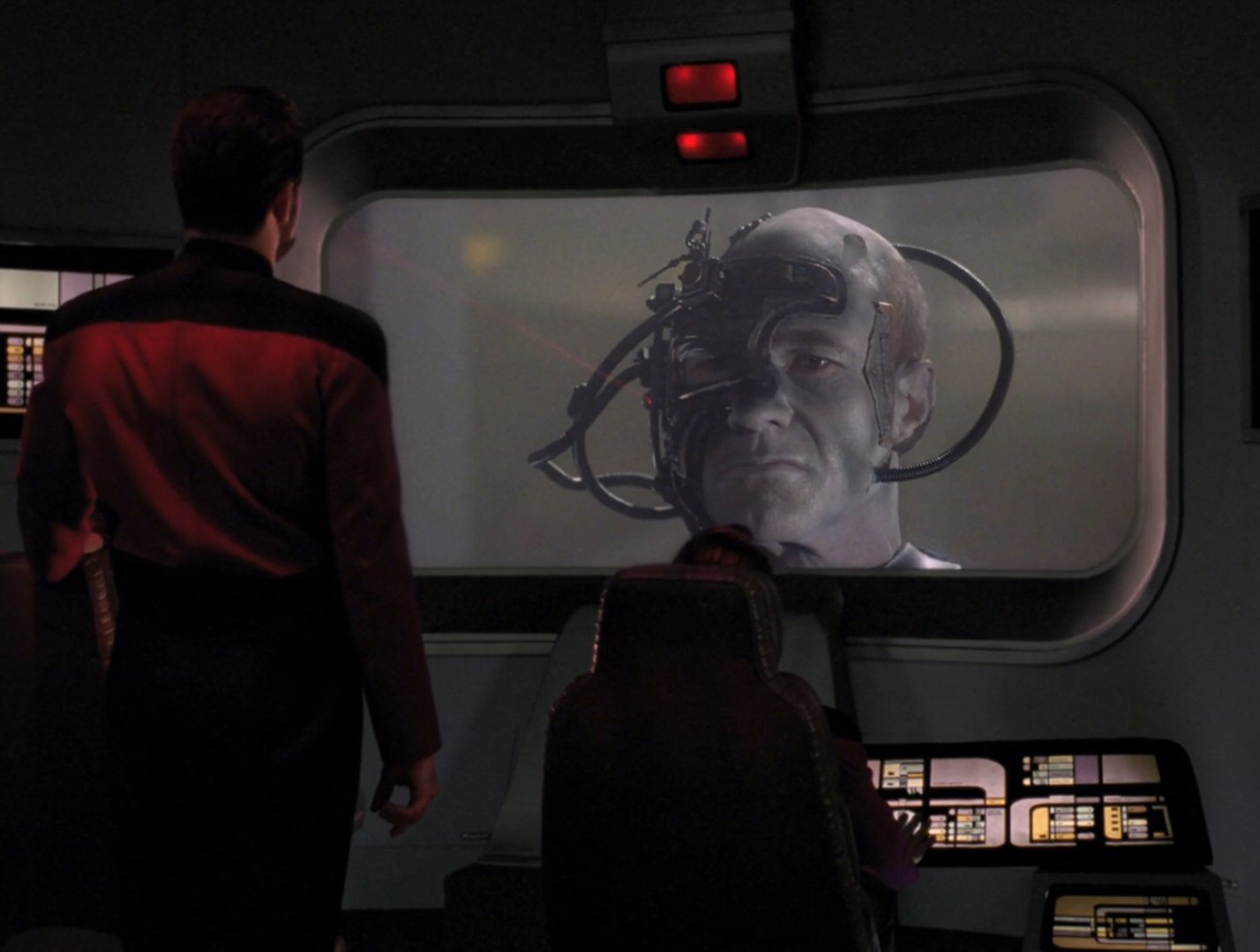 Indeed, what makes the episode so very effective is its cast’s delivery of the script, which is - quite deliberately - off-kilter. Riker’s mind is as much on his career as it is the Borg threat, while Picard is unusually quiet and brooding; he even calmly contemplates the fall of humanity with Whoopi Goldberg’s Guinan as he carries out his “traditional” pre-battle inspection of the ship. Even the bridge crew aren’t themselves, fighting fear and fatigue, as so wonderfully demonstrated by what may be either Wil Wheaton’s best or worst delivery of a line on the show, depending on whether you view it as wooden or so perfect a portrayal of fatigue that it just seems that way. Taken together, the performances all help to sell the stakes - this isn’t any old forty-five-minute runaround; this is the big one.
