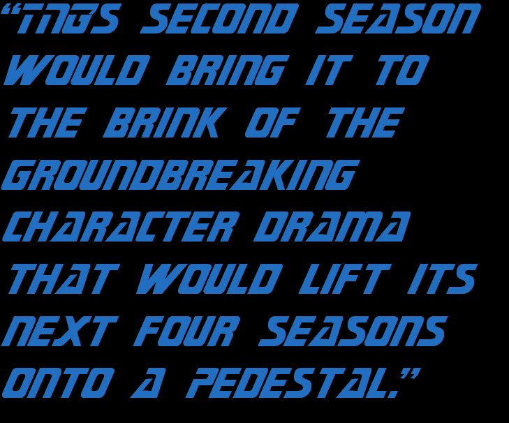 If TNG’s first season is the uncomfortable running in of a new warp engine, then its second is steady warp-five cruising with the occasional blast of warp nine. Still a show teeming with the original series’ (“TOS”) sensibilities, repurposed ideas (and this year, whole scripts too), and even a clip show that would shame The Simpsons, TNG’s second season would bring it to the brink of the groundbreaking character drama that would lift its next four seasons onto a pedestal. Here, key players assume their positions. Unstoppable foes are revealed. The stage is set for Michael Piller and his new writing staff.