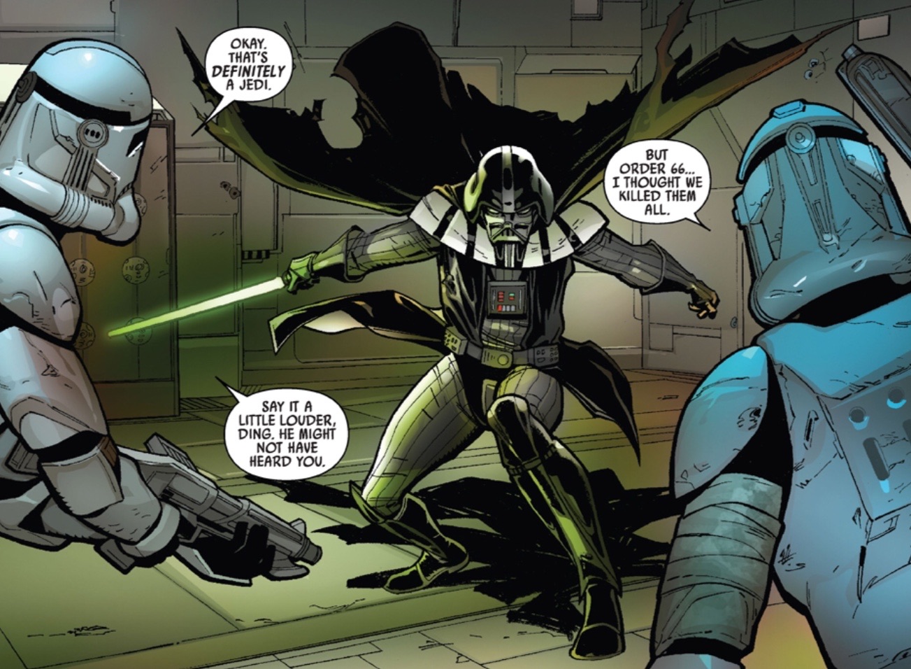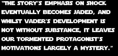 The remainder of the story lives and dies in the same vein. Vader’s Jedi hunt is the stuff of many a fan’s fantasy, and the fact that he’s battling Imperial forces with a green lightsaber for half of it only serves to make it all the more illicit and alluring. The trouble is, we don’t know what’s going on in Vader’s head. Even when he has a droid to talk to, his dialogue is purely procedural, and when he has someone to fight, any lines the calibre of, “When I left you, I was but the learner...”, or even the pithy-but-powerful, “Impressive. Most impressive,” are eschewed in favour of utterances like “Hssssssk!” and “Nnnngh!”, which I don’t recall existing in James Earl Jones’ goosebump-raising repertoire.