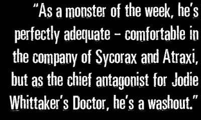 And so whilst “The Witchfinders” is far from being the calamity that “The Tsuranga Conundrum” was, it still failed to capture me. This season has been so fresh and so innovative that an episode reliant on a traditional alien monster masquerading as a witch and hidden within a witch-burning landowner feels a bit... meh.