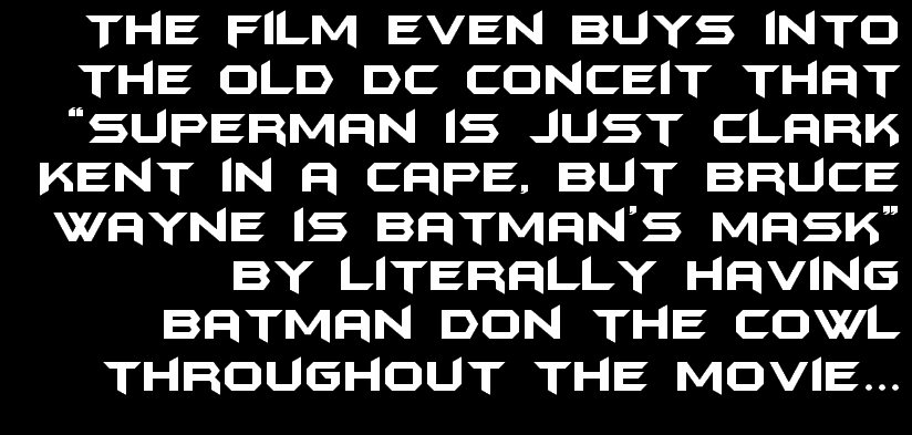 Yet inside, he’s still the child that lost his parents. He throws actual tantrums rolling around on the floor (his “No, no, no, no…” perfectly in tune to the old TV series’ famous theme), gets put in time-out, makes himself laugh with childish passwords (“IRONMANSUCKS” and “ALFREDDBUTLER”), and eschews any meaningful connection to anyone to avoid the pursuant hurt. I love in particular the humorous insight that the movie offers into Batman’s – not Bruce Wayne’s, mind, Batman’s – home life. He gets in from “work”, slips into something more comfortable (still wearing his cowl, obviously), then sits down to laugh at a romantic film, which he seems to genuinely believe is a comedy. It’s brilliant. The film straddles the fine line between tragedy and humour dexterously, somehow portraying a tragic character as a hilarious one without really altering any of his core characteristics.