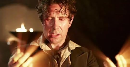 And it wasn’t just any regeneration that “The Night of the Doctor” showed us. Far removed from the innocuous bang on the head that we long thought had done for Old Sixy, or the ravages of old age that killed off the Doctor’s first incarnation, this was a little death that had been speculated about with great fervour ever since Christopher Eccleston’s Doctor alluded to his role in the Last Great Time War, and as such it would have had the impact of la petite mort even without the Sisters of the Flame’s iniquitous, fan-pleasing intervention or the veritable pipe bomb of the eighth Doctor not regenerating into the ninth. As it happened, though, Steven Moffat’s mesmerising master stroke cut right to the heart of a contradiction that had blazed throughout the revived series, irritating everyone from the fans in the forums to those such as Davros sat on the other side of the fictional divide. Whether it was in the name of peace or sanity or both, in the most destructive conflict in the history of creation, the pacifist Doctor committed double near-genocide – and he did so himself. Whatever labels subsequent incarnations would give to Eight’s successor, it was the eighth Doctor who made a conscious choice to eschew the trappings of his carefully-chosen title and be reborn as a warrior capable of ending the Time War. The duress might have been extreme, but nonetheless the “man who never would”, most definitively did.