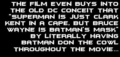 On the hero side of the divide, most of the heart and humour is borne of Batman’s relationships with his bumbling ward, Dick Grayson (Robin), his loyal butler – and surrogate father – Alfred, and the newly-minted Commissioner Gordon… Barbara Gordon. The first admires him, the second loves him, and the third thinks that she’s better than him (and what’s funny is, she actually is – just look at the stats she’s got to prove it!) Every scene manages to be both witty and insightful, making the audience laugh while progressing the narrative and, more often than not, making light of hitherto inviolate comic book lore. Take Batman telling Robin to use the “dark parts” of his [bright yellow, red and green!] costume to blend into the night, for instance - it leads into Barbara promptly spotting them both, reinforcing Batman’s ineptitude in her eyes. Similarly, Batman’s aggressive, unforgiving “encouragement” of Robin as he infiltrates Superman’s Fortress of Solitude leads into a delectable scene in which a devastated Batman finds the entire Justice League – not just the big guns, but Hawkman and Hawkgirl, Green Arrow, the whole lot of ’em – having a party without him.