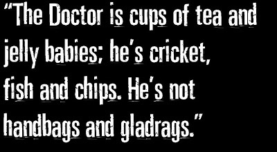 When it really comes down to it though, my anti-female Doctor sentiments are really borne of two completely illogical feelings, and I suspect it’s the same for many other long-term followers of the show. The first is that, lack he is for a lot of fans, the Doctor’s something of a role model for me – a wacky, zany, dazzling figure to idolise and aspire to. And, whilst there’s nothing to stop a man having a female role model, I really couldn’t imagine switching my brown pin-stripe suit or black leather jacket for a frock or a blouse. You may scoff at such sentiments in a near-middle-aged man, but transpose that onto the playground level: thousands if not millions of disenchanted, confused little boys wondering what in the blue hell has happened to their hero. Yes, many little girls might be drawn to the show as a direct result of having a female Doctor, but far fewer, I reckon, than the young boys that would be driven away.