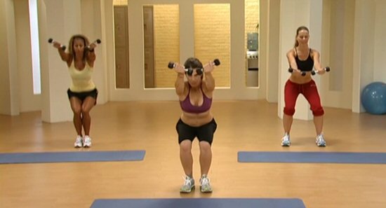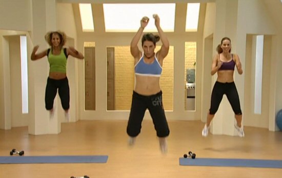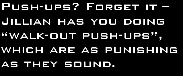 Level 3, though, is the business. Walk-out push-ups become the altogether more taxing travelling push-ups; lunges segue into full-blown, ankle-crushing plyometrics; pilates moves go nuclear as you go for an elbows-walk in plank position; you even get to graduate from stomach crunches to old-school sit-ups. It’s so taxing that, for the first time since starting the Shred, I was thankful that Jillian had one of her colleagues performing “modified” versions of the moves for me to emulate for a while, although I’d have preferred it if she’d have had a legitimate beginner on hand to do them instead of an über-lean blonde whose smile doesn’t even break, never mind her breaking a sweat. The cardio is made much more difficult again too as Jillian’s old and now familiar moves must be performed with hand weights – butt-kicks, with weights; shadow boxing squats, with weights… you get the idea. Again, I was wishing I’d got more hand weights ready to go in the living room, but this time for the opposite reason: jumping jacks with 5kg weights is downright dangerous.