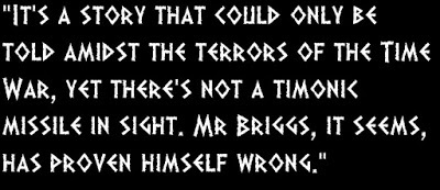 As the story moves into its second and third instalments it picks up a lot of pace, but, pleasingly, not at the expense of substance. Briggs’ plot cleverly pits the Doctor and an older Rejoice (now played by the perpetually regal Carolyn Seymour, veteran of countless 24th-century Star Trek episodes) against Seratrix, a dangerous Time Lord idealist who’s hell-bent on appeasing the Daleks in a desperate bid for peace. This unexpected anti-antagonist highlights the gulf between the Time Lord’s warrior incarnation - the ‘War Doctor’, if you will - and the Doctors either side of it. In any other story, and against almost any other enemy, the Doctor would be the one advocating peace. It’s a story that could only be told amidst the terrors of the Time War, yet there’s not a timonic missile in sight. Mr Briggs, it seems, has proven himself wrong.