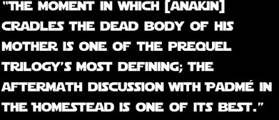 Anakin’s return to Tatooine and search for his mother is also very well handled, again setting the stage perfectly for Episode III . The moment in which he cradles the dead body of his mother, his eyes wide and face contorted in horror and rage as John Williams’ score builds to a crescendo, is one of the prequel trilogy’s most defining; the aftermath discussion with Padmé in the Homestead is one of its best. In the latter, Christensen really shows us what he can do as Anakin’s tear-stained rage and remorse boil over into a chilling monologue that walks a terrifying tightrope between despair and determination. Years later, he would say to his son, “There is no conflict…” - but here there clearly is, and it’s arguably a much more fascinating area to explore.