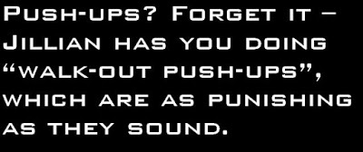 Like the whole Shred series, Level 1 is built upon Jillian’s patented 3-2-1 Interval System, which, after a warm-up, you have to endure three times before the cool-down. Jillian’s three minutes of “Strength” are broken down into two repeated resistance moves lasting around forty-five seconds apiece, on average (sometimes the harder moves only take about thirty seconds, the easier a minute or so). The moves are generally straightforward – push-ups, squats with hand weights, rows, lunges and the like – but what makes the workout so hard is its incessancy. From “Strength”, you’re straight into your two-minutes of non-stop cardio – jumping jacks (star-jumps to us Brits), butt-kicks (arse-kicks), jump rope etc – and from there, onto a merciless minute of abs agony. There’s an almost imperceptible rest period of about two and a half seconds between each circuit; I didn’t even notice it until the third or fourth day as it’s so short. That’s the only breather you get. That’s not a complaint, mind – it’s why the Shred is so effective a workout, not just in terms of the results that it yields, but also the little time that it takes to do. No, my one and only gripe with Level 1 is its unevenness. To me, at least, whilst much of it was challenging in the extreme, other parts – the chest flyes, for instance – felt like a complete waste of time. To make this level work as intended for me I’d have had to have a whole rack of hand weights next to the telly, enabling me to increase the resistance as and when required.