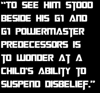 If this toy has a weakness, it’s that it’s not really fit to be used as such. The transformation process is involved and laborious; a stark contrast to the original’s delightfully straightforward change, which could be effected in less than the time it took to make the commensurate noise. I don’t see this as a major issue though as, doubtless, these Transformers are clearly intended as display pieces rather than snot-and-toybox fodder.