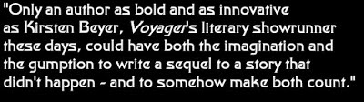 Coming out of the novel, as ever Beyer leaves threads hanging, the most intriguing and emotive of which concerns the fate of Voyager’s chief engineer, Nancy Conlon, and her on/off lover Harry Kim. Beyer could have glossed over Nancy’s possession in the previous novel with a brief acknowledgement or an aside, as the TV series probably would have, but instead she uses it to push both characters in a new direction that raises a whole host of moral dilemmas in true Trek style while exploring issues that I don’t think any Trek series has ever broached in depth: unwanted pregnancy and long-term, potentially terminal illness.