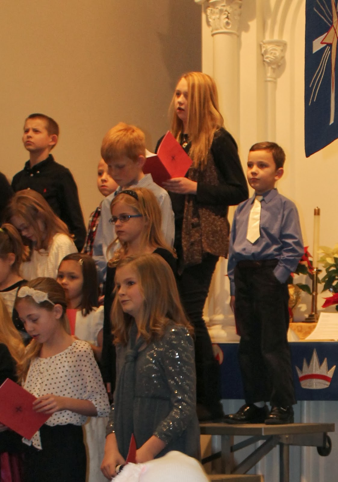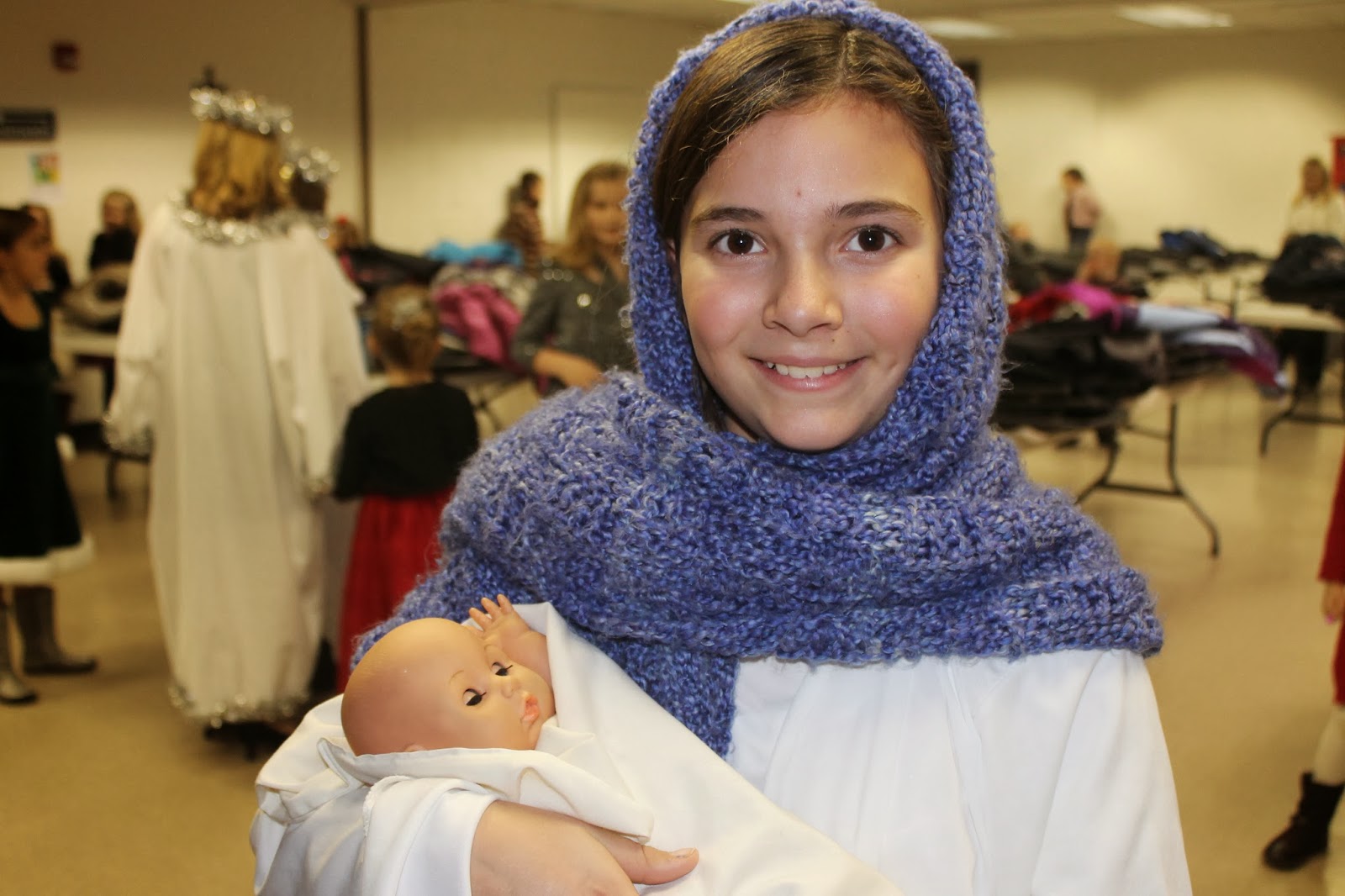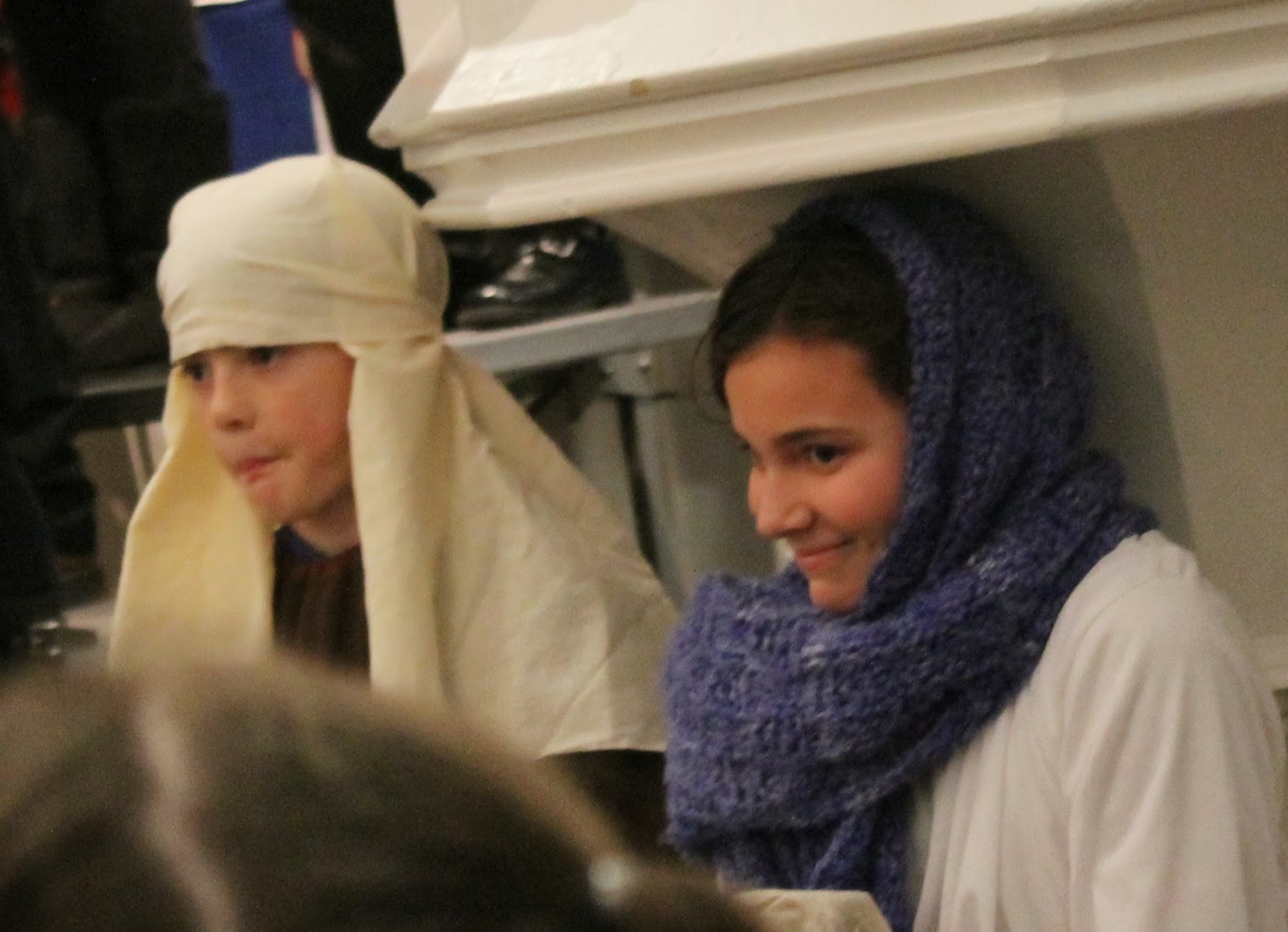 But with a little help from Grammy Pammy (ok, a lot), we leave on time. Five kids in dress clothes, and one dressed as the Virgin Mary. I notice the nervous smiles on the older children, so I give a quick encouraging hug.