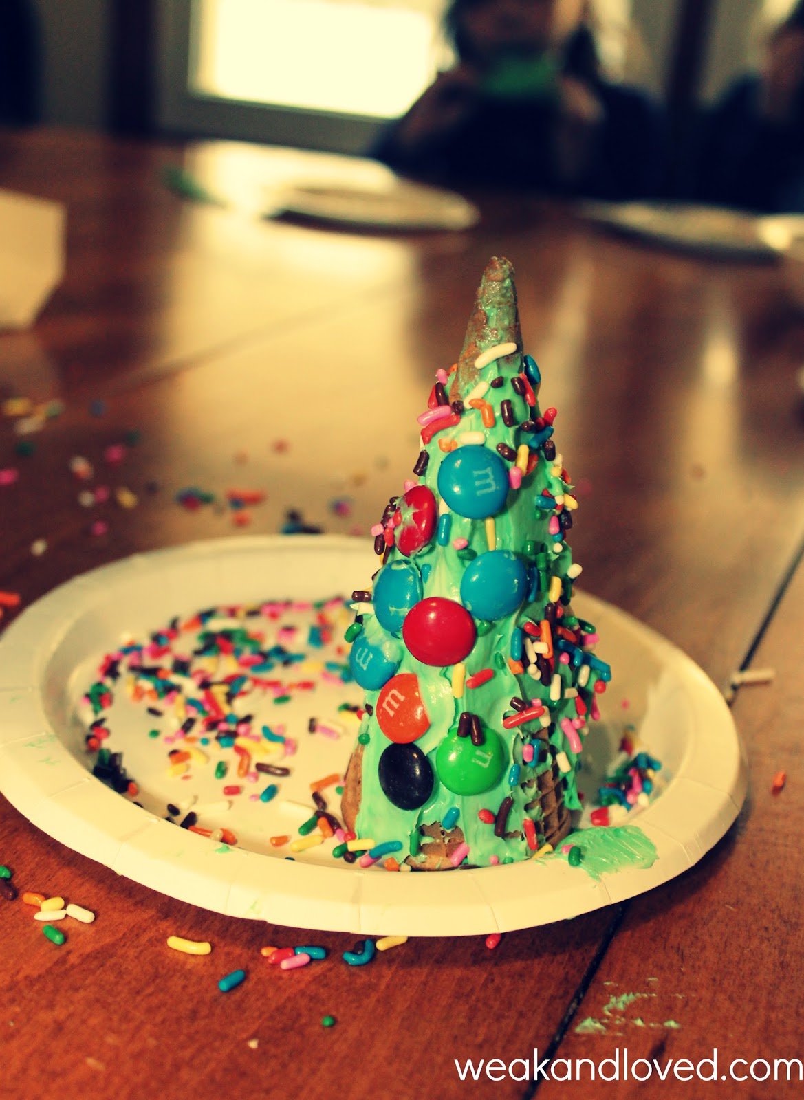 Waffle cone tree.I am worn out, in a good way, from a weekend with family. I just woke up from a delicious nap, and my brain is slowly starting to clear. I want to start thinking about the next influx of company, the next round of Christmas, that starts in two days.