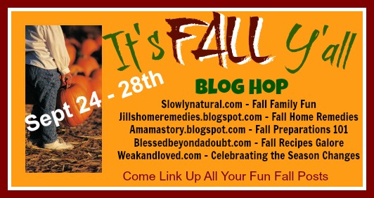 Monday: Slowly Natural ~ Fall Family FunTuesday: Jill's Home Remedies ~ Fall Home RemediesWednesday: A Mama's Story ~ Fall Preparations 101Thursday: Blessed Beyond A Doubt ~ Fall Recipes GaloreFriday: Weak and Loved ~ Celebrating the Season Changes
