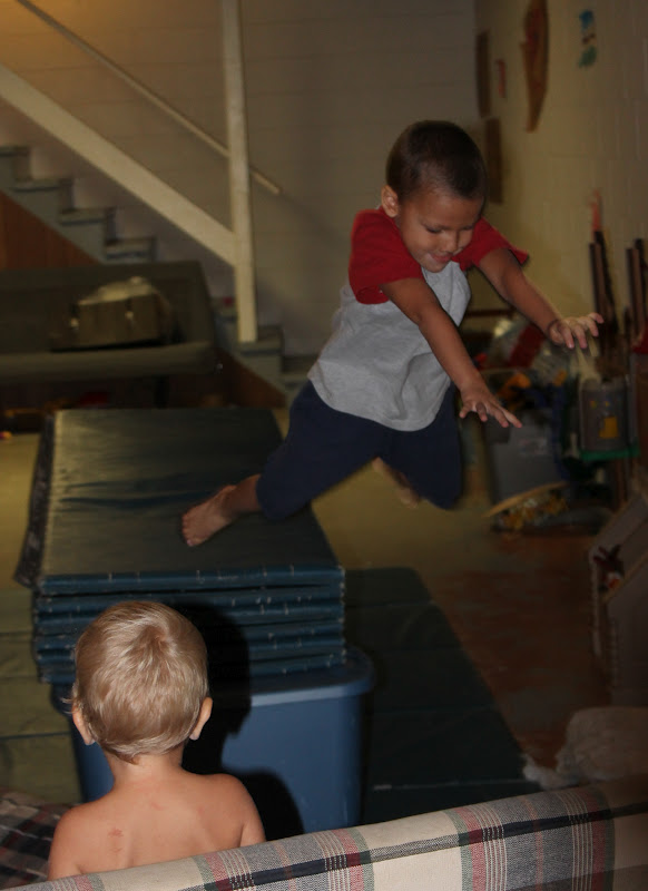 (Grandmas, don't worry. Note the mats underneath the plank. Their falls were cushioned. I give this a mild-to-medium danger-rating. Please also note: more than one of these boys walking down the hall at the same time is ALSO an activity with a mild-to-medium danger rating.)