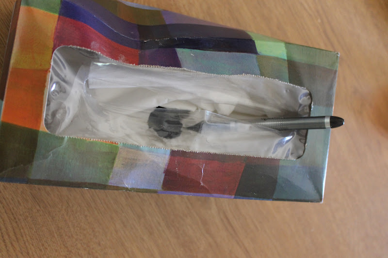 So I have this daughter with a cold, or summer allergies, or something. She is contstantly blowing her nose, and leaving her tissues around. This time, she left her tissue box outside by the pool. Someone (a little brother) found a fountain pen and thought it should be inside the tissue box, with its cap off. Now and entire box of tissues has a big black blob of ink in the middle.