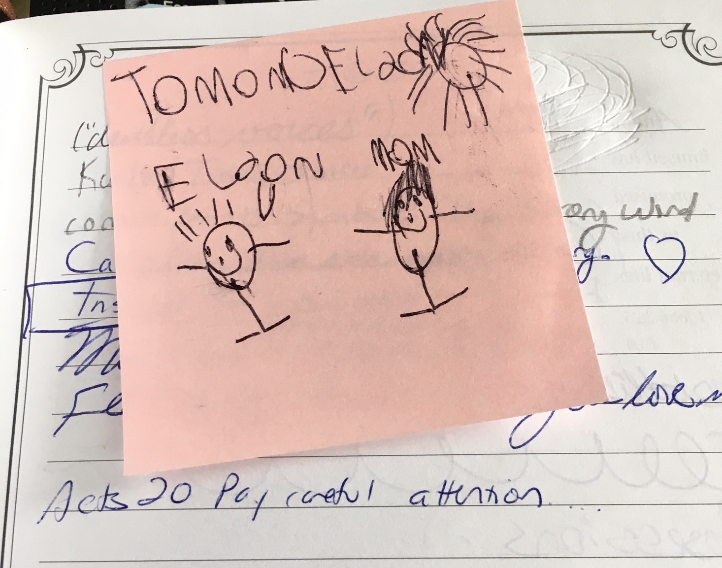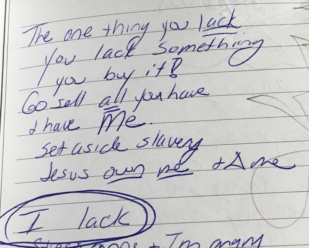 You'd see random names: prayer requests, or people I see or think of that might need a word of encouragement in the coming week. Sometimes, I send a card, or bring them to God in prayer. Sometimes, I do not see the names again until the next church service, and then I bring my guilt to God along with those names.