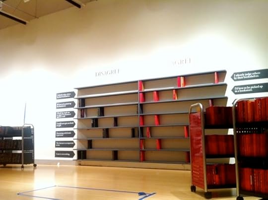 Part of the project is a short survey online that asks you to agree or disagree with such statements as “I would never give an ebook as a gift” and “Decorating with books is perverse”. Those same questions are asked at the exhibit too as an installation that allows viewers to physically shelve books as votes (as seen in the photo above). Very cool.