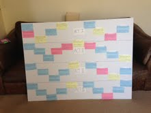 Moving towards the 100th post, I'll continue to post about my writing process and whatever else piques my interest that particular week. I just finished putting together the major scenes from the novel I'm about to start writing. The blue cards belong to the main character. The yellow are scenes from the antagonist's POV. The pink cards belong to the love story. I can glance at the board and see where I might need to add more pink or yellow (or less), and I can rearrange the scenes before I even start writing. I've dabbled with them enough, and now I'm ready to start writing. Heck, I might get to the end of the first row and throw out all the rest because I discovered some really cool storyline that will work better.