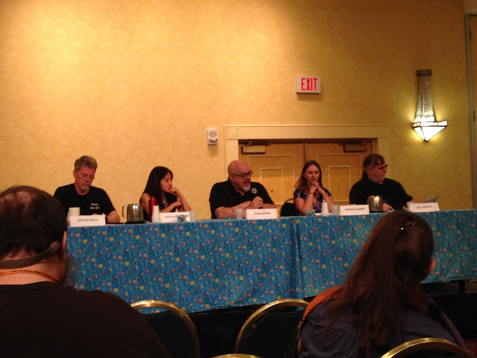 Panel on writing different gendersThe last panel I attended was on writing different genders. World Weaver Press editor Sarena Ulibarri (who edited my latest novel Fractured Days) was on this one. All of the panelists had great things to add to the discussion. I was lax at this point about noting who said what, so most of this is my best guess here. I believe S. M. Stirling was the one who pointed out that sometimes socioeconomic differences stood out more than gender differences. He relayed a story about two women police officers out on patrol. One calmly tried to talk a perpetrator into relinquishing his weapon. The other simply grabbed it and, uh, rather forcefully handled the situation. There might have been some blood involved. At any rate, one woman came from an upper middle class background, while the other came from a blue collar family. Guess which was which?John Barnes also made a great point when he said that there are cultural gender differences. Men have been socialized to have agency. "You pick up the wrench and do it." Sarena said that when you create your own world, such as a secondary world fantasy, you get to choose who gets agency and who gets what role. The panel also touched on non-binary genders, and when it comes to writing a transgender character, for example, Sarena suggested reading something by--rather than about--someone transgender. And finally, because this was quite possibly one of my favorite quotes of the whole weekend, S. M. Stirling said, while describing his experience at an all boys' boarding school, "It's like being locked in a baboon house at the zoo."