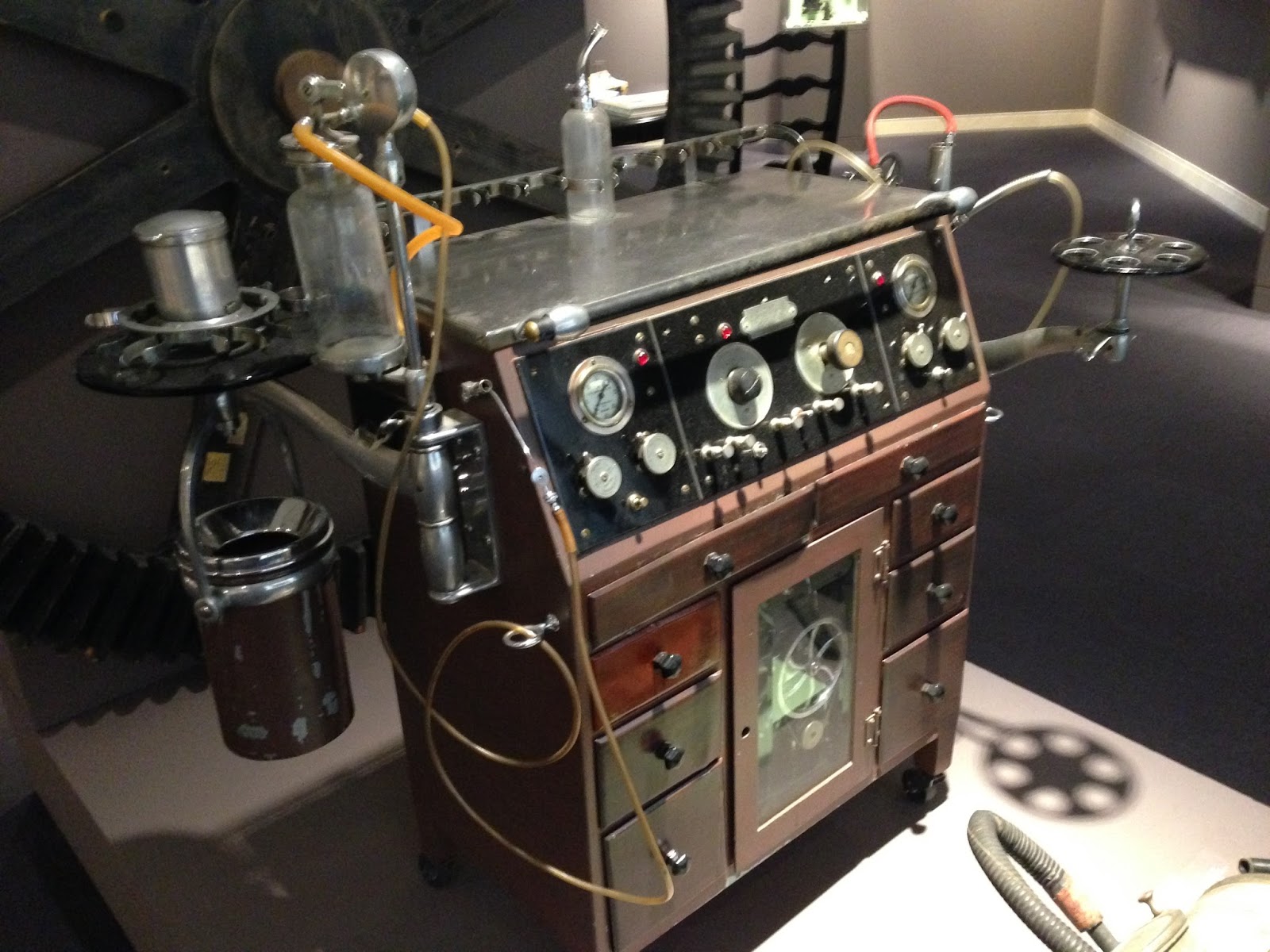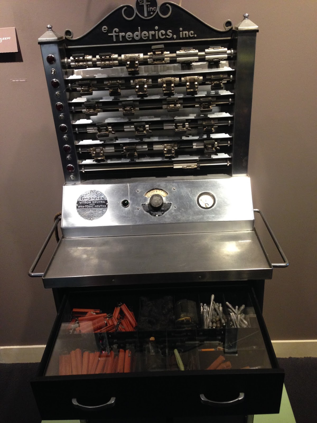 De-luxe ENT machine, or torture device?He copied a couple of paintings, then we headed to an exhibit of old stuff, like counting machines, a hundred year old typewriter, a hundred year old desk phone, and a cozy little De-Luxe Ear, Nose, and Throat machine used in a doctor's office. You wouldn't mind your doctor coming at you with those implements, would you? There was also an old perm machine from the 1920's. What the picture doesn't show you is the mask hanging above it with empty circles for eyes and an empty circle for a mouth, as if the person is screaming forever. Because there's nothing like the idea of eternal pain to draw people in for a permanent.