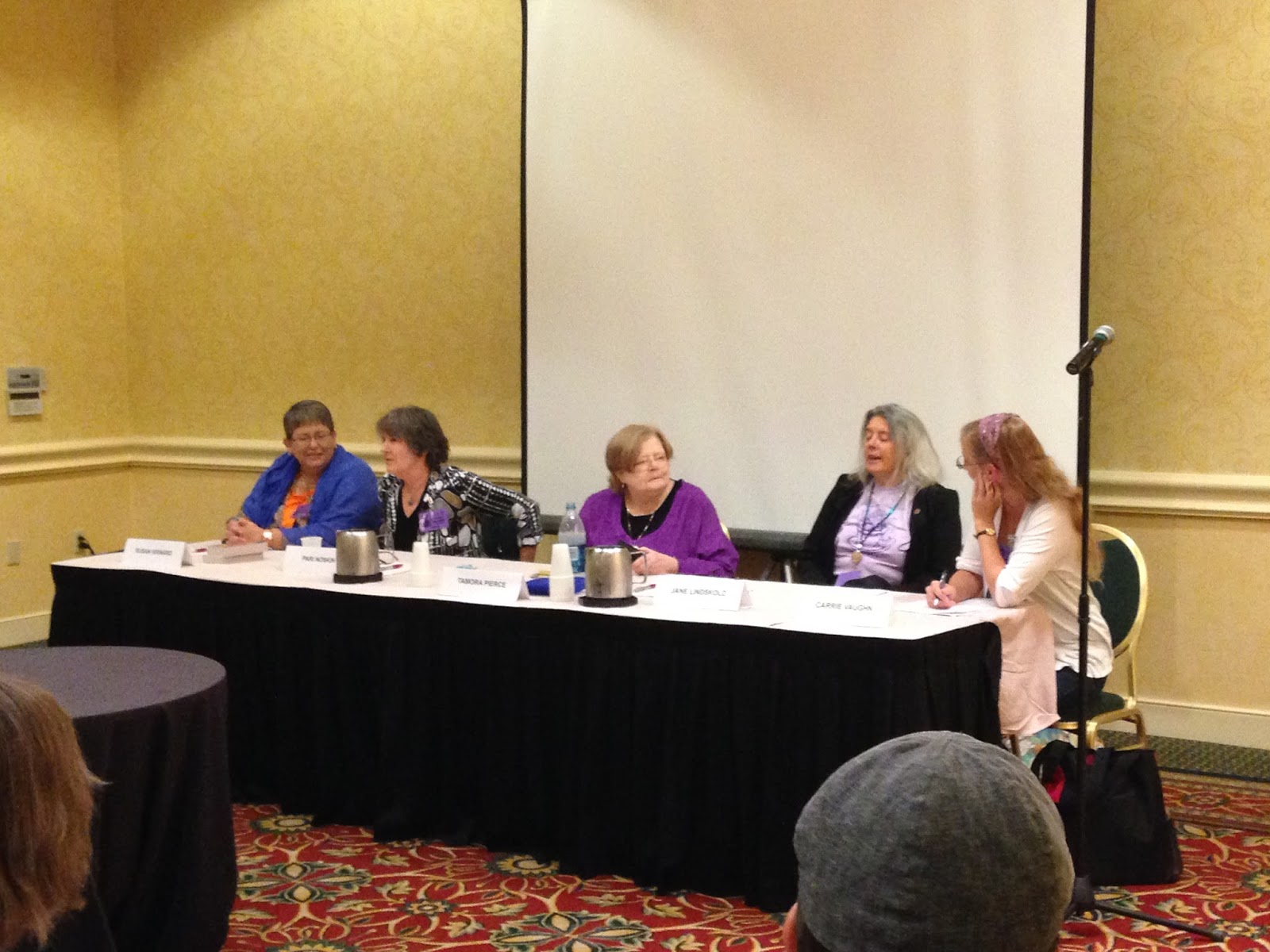 Panel on whether strong women need strong menAnother panel asked the question: Do strong female characters need strong male characters? Susan Krinard said strength does not necessarily mean muscle bound; there are different types of strength. Pari Noskin said she thought strong means having a solid self identity and core. Strong women don't need strong men. Jane Linskold said men should not be strawmen who exist simply to show how strong the women are. Carrie Vaughn flipped the question around and asked whether strong male characters need strong female characters, and Tamora Pierce said you should have well rounded characters in general. This panel went on to discuss LGBTQIA pairings as well as pairings between characters who were simply friends and not love interests.