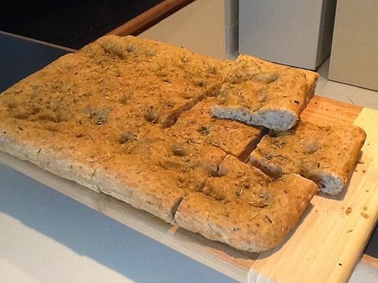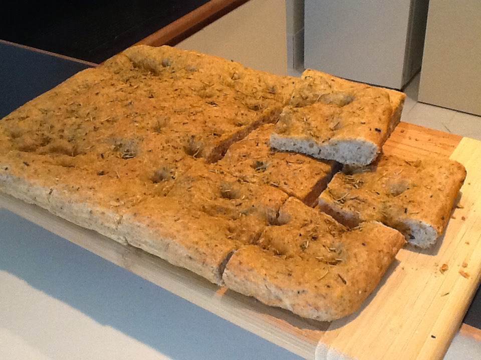 5. Poke some divots into the top of the loaf, then drizzle with the remaining olive oil and sprinkle with sea salt and rosemary. Reduce the oven temperature to 375F/200C and bake for about 30 minutes. Cool on a rack and cut into squares.
