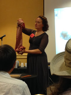 Scarf dragon puppetI also attended a highly entertaining and informative panel on puppetry given by Mary Robinette Kowal. She turned an ordinary scarf into a dragon to demonstrate movement, breath, and rhythm. She showed pictures of some of the puppets she's worked on. She told a hilarious story about a puppet show fail (I'm still chuckling). One of the things that stuck with me, though, was how the person operating Big Bird is, of course, inside the bird, but also has their right arm fully flexed overhead with their hand operating part of the puppet. I immediately thought, "Oh, that poor person must suffer some severe shoulder impingement at some point." And then I couldn't get it out of my head, imagining a patient coming in because of shoulder impingement from operating Big Bird's head, and how that medical note would go...