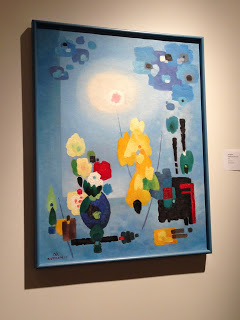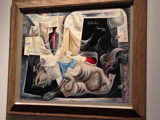 Math artWe started in the New Mexico Artists' Exhibit. The pieces are changed out from time to time, but there are some enduring ones, such as this rendering of a low rider's dash and steering wheel. I love the colors and the textures. It's one of my favorite pieces in the ongoing exhibit.As we were walking through, my son said, "I want to find some math art." We ended up looking at some abstract art, and he found a piece that spoke to him. He promptly sat down and started drawing while muttering things like, "And another circle here, and a tree there." I sat and studied the piece below with all the sharp angles. I love the angles and the way the artist depicted the hanging sheets. I also thought, "Yep, sometimes I feel like I'm about to get run over by a bull."