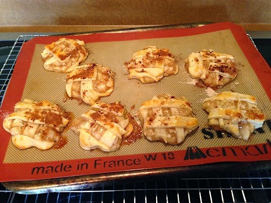 I could hardly wait for them to cool!To celebrate breaking through with this novel and getting most of it written, I made some apple pie cookies. I heard about these cookies on the online writing forum I belong to, Codex. I've been dying to make them ever since. They just looked so perfect, like you could hold a cookie pie thingie in one hand and a cup of coffee or glass of milk in the other and just shovel it in your mouth. Sweet, delicious pie in the shape of a cookie! What a brilliant idea.I followed the recipe exactly. I made a thin layer of apple pie filling, but I think in future attempts I'll thin it even more. It was a lot of filling for the poor pie pastry to hold when I lifted a 'cookie.' But oh, so delicious! You can take a bowl of ice cream and sit two warm cookies on top. Or put the warm cookies in the bottom of a bowl and scoop the ice cream on top to melt over them.