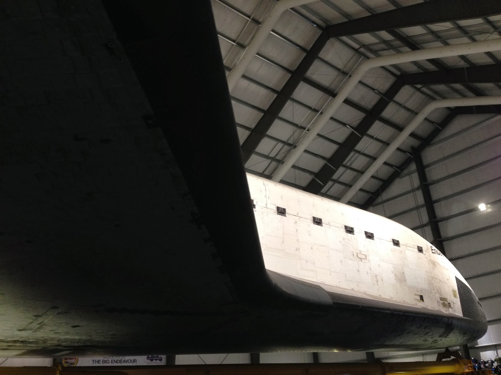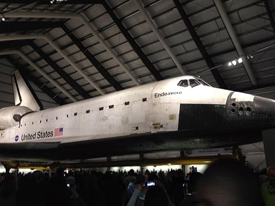 Sweet shipThe line to see the shuttle was long. There was a wait in one area, then a walk and a wait through another area that showed a shuttle potty (there are an awful lot of straps involved), a display about eating in space, a mock-up of the control center, a timeline of Endeavor's missions, and a video of bringing the shuttle to the building that now houses it (talk about a wide load). And then, finally, we entered a large, corrugated building, and BOOM! Her nose was right there.Endeavor looks like it's been through a lot of flights. A lot. She reminded me of an old car with a couple hundred thousand miles on it. But despite all the abuse, she's still a beautiful ship. Outdate for sure, but beautiful.