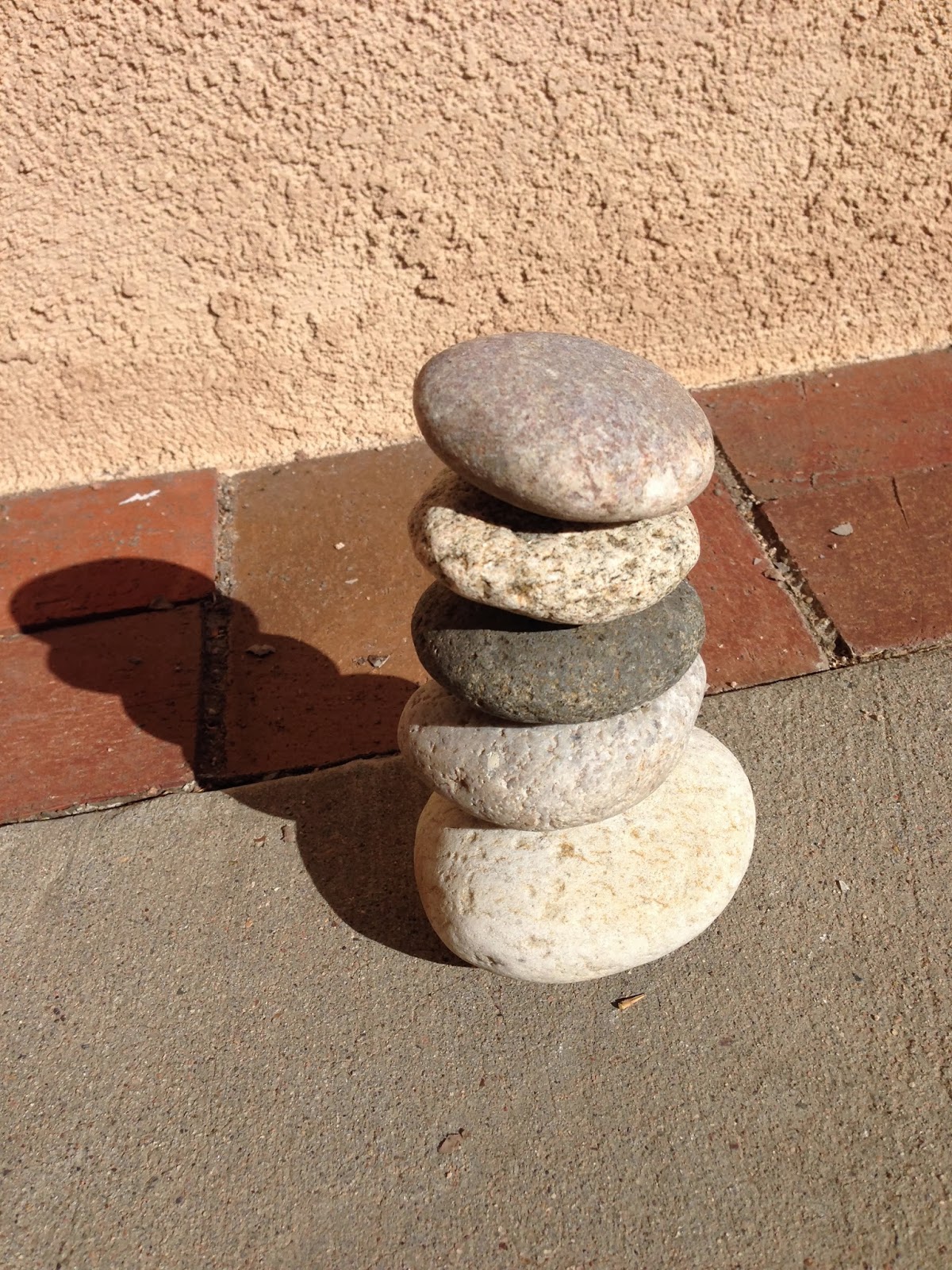 After looking at some rock balancing art, I was inspired to create my own. Living in the Southwest where xeriscape is the norm, I had plenty of rocks to choose from. To my surprise, I stacked seven rocks rather easily, feeling how each needed to balance in order to sit on top of one another. I felt pretty smug about it. I went inside to get my camera, and when I came back out, my dog went to my sculpture and licked it, knocking it down. He licks everything. Everything. Anyhow, it was much more difficult to stack rocks the second time around, so I ended up with only five.
