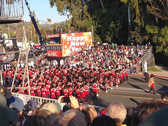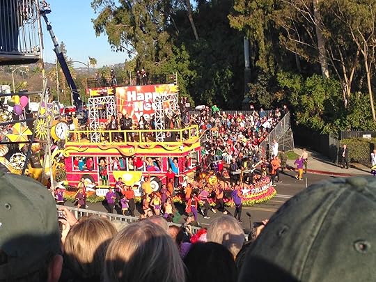 My favorite floatBecause watching the parade on TV doesn't do it any justice. None. It doesn't even compare. When you're there, sitting just beyond that first, slightly-greater-than-ninety-degree turn, you get to watch the sun brighten the sky. You get to watch sky writers put out message after message. You get to look up at any point and see the Goodyear Blimp floating quietly overhead. You get to see people milling around on the street until the moment before the parade starts. You get to walk over a staging area where people in costume and horses and the bands' buses have gathered in the highway's median. You get to hear a couple of young women hawking the program. "You want 'em. We've got 'em." You get to smell coffee brewing. And then, the pace car and sound car come through. They pause. Fighter jets zoom over, leaving contrails in the sky. You wait. And then the first float comes around the bend, and it's a giant, futuristic car, towing a train, which is towing a giant TV camera, which is towing a giant screen showing the crowd. You get to feel the bands' drums vibrating in your chest, and hear the women behind you make catcalls at the bare-chested men leading the Hawaiian band (way to stay classy, ladies).