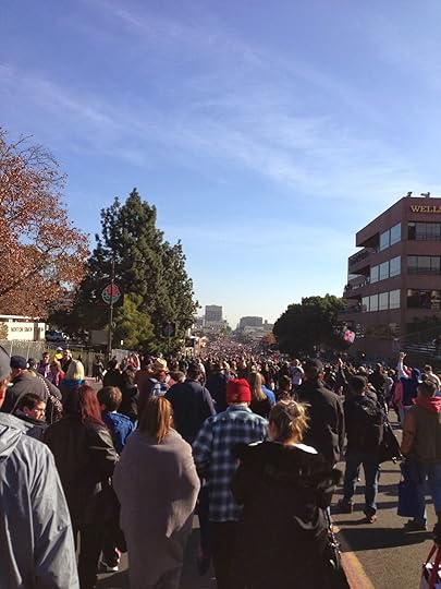 A million people trying to leave PasadenaAnd then there's the part they never show on TV. The post parade, where people come through with their homemade signs and floats and costumes, mostly showing political ads like "We're felons" on a background that looks remarkably like Wells Fargo, or the guy holding a "Wake Up" sign upside down (he should've had some coffee). Looks like someone should have taken his own advice. Or the guys holding Jesus signs and wearing loudspeakers and proclaiming gloom and doom and how everybody is going to hell. One of them ended up at our line into the metro. Captive audience, and all that. After they passed, everybody climbed down from the bleachers and followed the parade route. There were bits of asparagus and rose petals on the ground. There are tons of people waiting to lead tours.